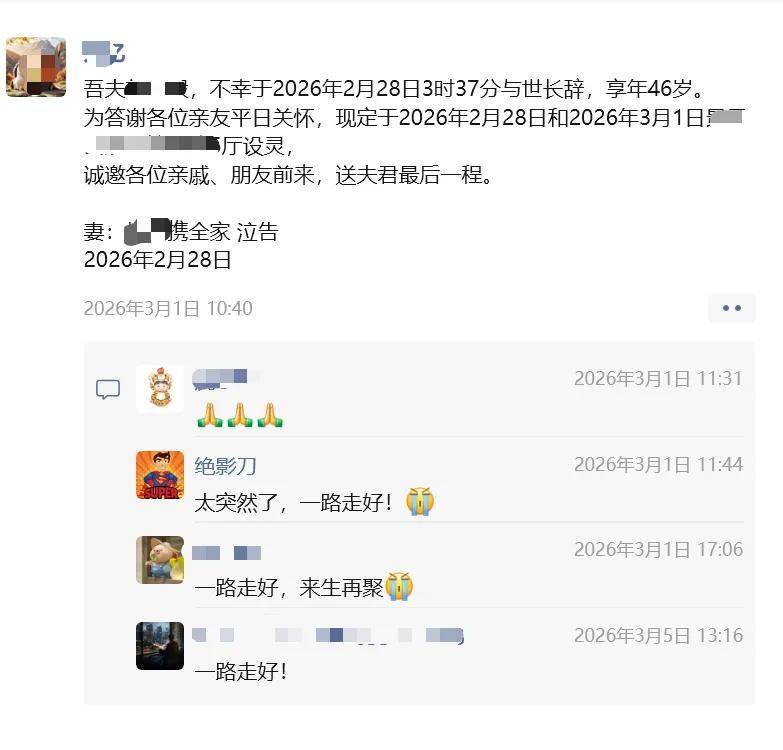 一则讣告赫然在目,是他妻子发的:老刘于2026年2月28日3时37分辞世,享年46岁!