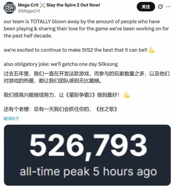 面对玩家的热情,开发商Mega Crit在社交媒体上激动回应:“我们的团队被过去几天里游玩并分享对这款游戏热爱的玩家数量彻底震撼了。我们花了五年多时间打磨这款游戏,看到这样的反响无比激动。我们将继续努力,让《杀戮尖塔2》成为最好的样子!”