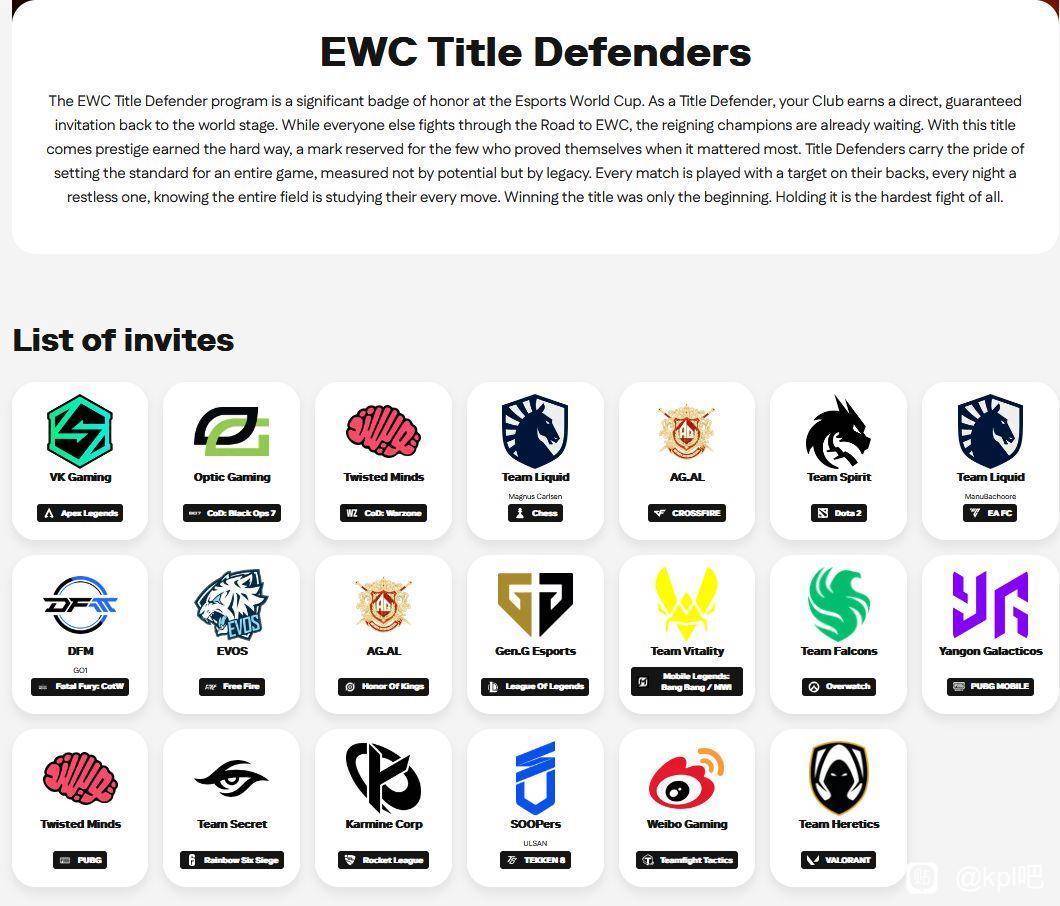 今年沙特EWC有直邀机制,上一届的冠军不用担心名额的问题了,AG的王者分部和CF分部,WB的云顶之弈分部