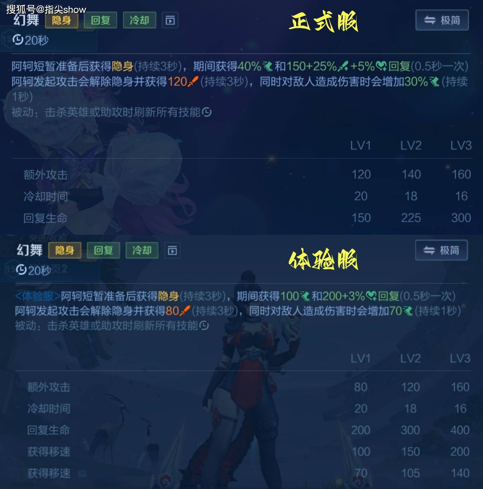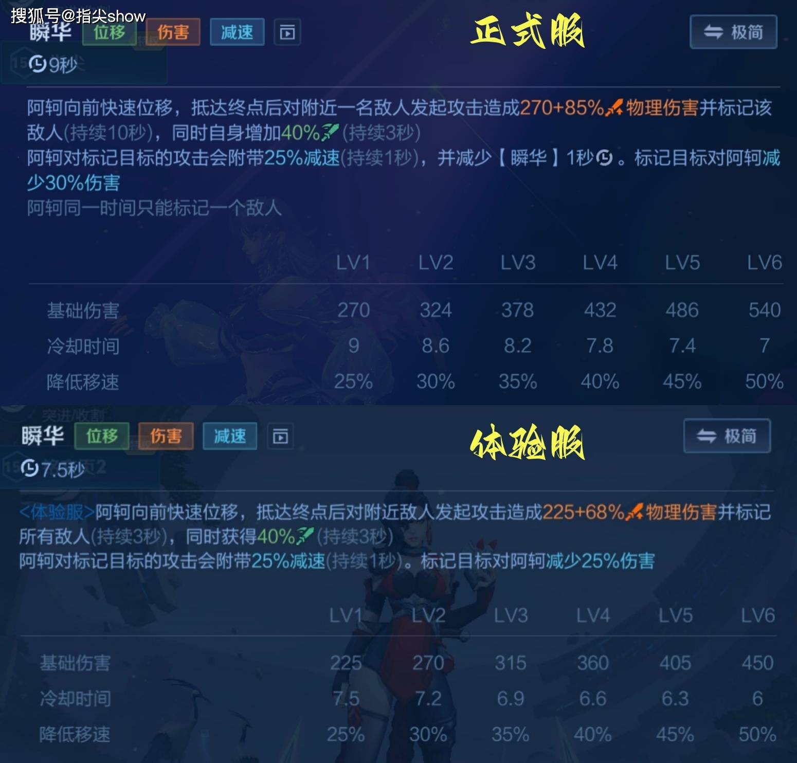 体验服调整后,变成了成长型移速,移速加成根据大招等级,分别是100/150/200,攻击敌人增加的1秒移速则是70/105/140,前期削弱了不少,但后期却是加强的。