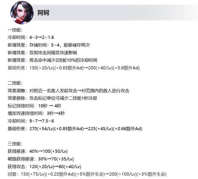 阿轲重做加强:被动改为正面也可以暴击,越往背后暴击率越高,且溢出的暴击率会转化为暴击伤害。1技能改为可储存两次,释放速度受攻速影响。2技能改为攻击范围内的目标,标记时间和CD缩短。3技能的前期移速和攻击降低,但回血增加。