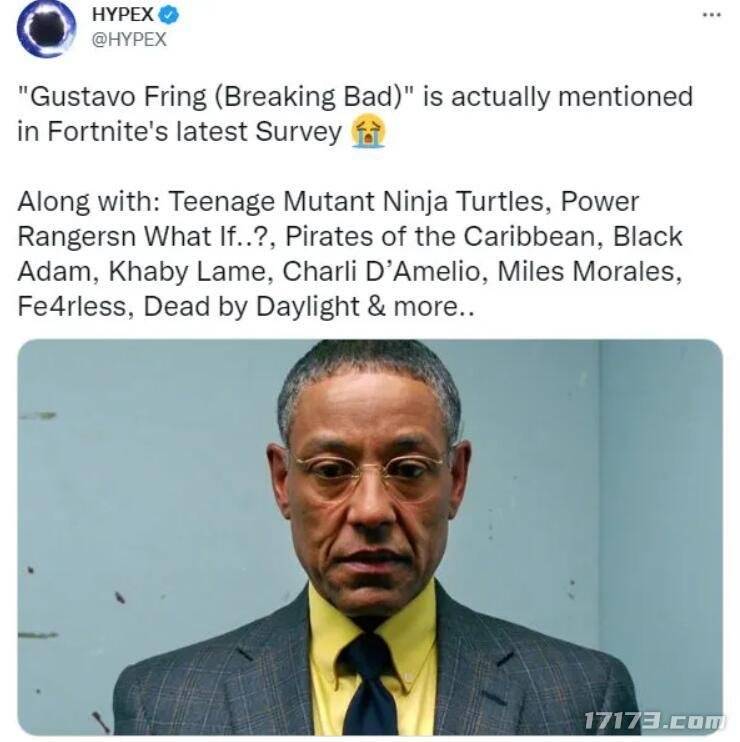 2022年,有知名游戏大佬爆料《堡垒之夜》将和经典美剧《绝命毒师》联动,剧中的经典反派“炸鸡叔”古斯·弗林将会登场。炸鸡叔在是剧中表面是一家炸鸡店的老板,其实真是身份是一个大毒枭,因为演技了得给人留下了深刻印象。