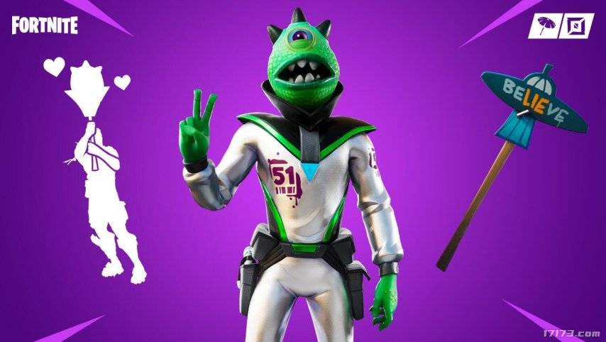 没两天《堡垒之夜》的策划歪脑筋一动,就联动了“解救51区外星人行动”,在游戏里加入了火影忍者跑,还顺便增加了一款非常刻板印象的外星人皮肤。