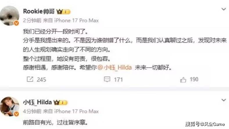 Rookie的回应就比较长了,分手确实是他提的,两个人已经分开一段时间了,除此之外就是对小钰的祝福,谈了9年,同居超过6年,这都没结婚,那肯定是有一方,没有这个打算了,虽然大家都期待他俩修成正果,但客观点来说,谈这么久不结婚的话,后面一起走下去的概率就很低了。