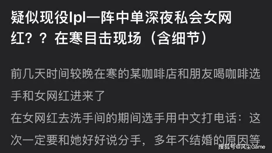 没想到第一赛段刚结束,两个人就官宣分手了,中间出了什么问题谁都不知道,但有网友在他俩官宣之前,就爆料一些内幕消息,爆料人称:LPL一线中单,在韩国咖啡店和女网红约会,女方去上厕所的时候,这位选手用中文打电话,大致内容是说分手,讲清楚这么多年不结婚的原因。