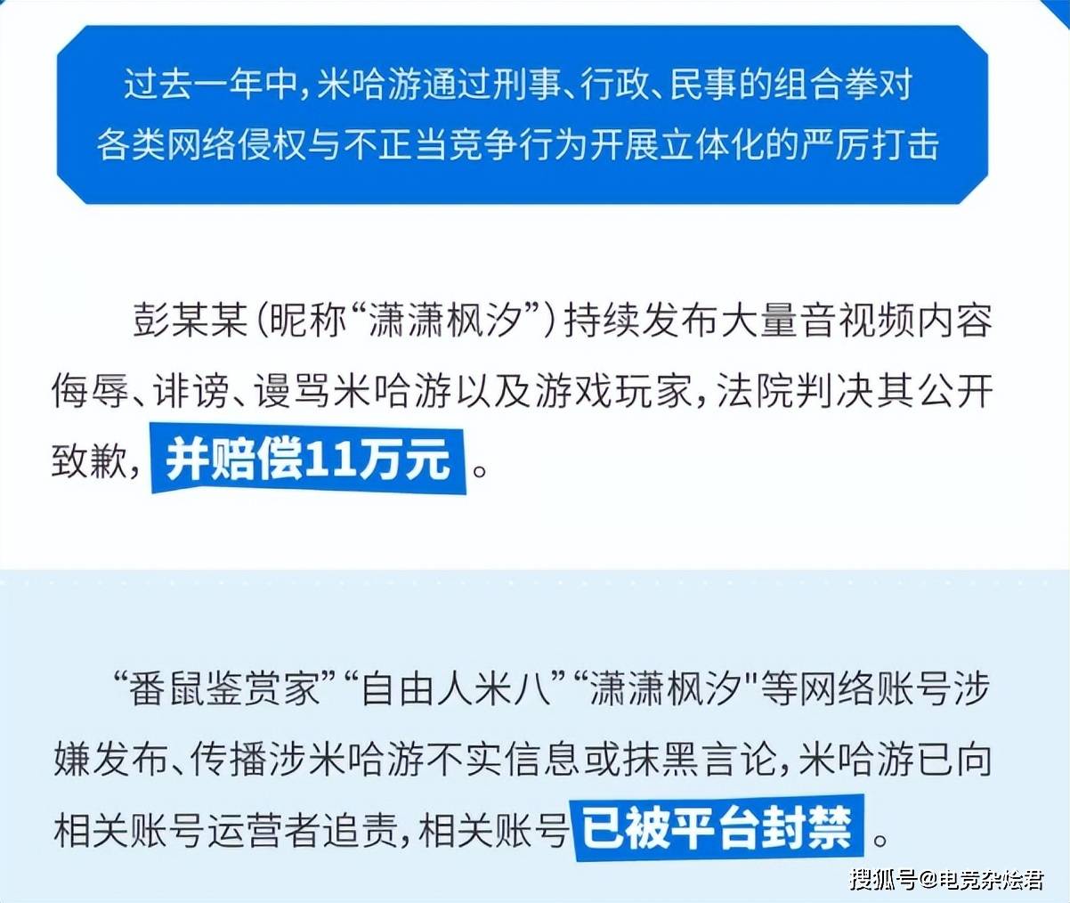 不少玩家可能看到这些网络账号都有些眼熟,早在今年年初,报告中提到的一些人就已经被法务部重拳出击。尤其是开头的“番薯鉴赏家”因为崩铁的流量大、人气高,时常带黑节奏给自己拉人气,每每让不少玩家气愤填膺。