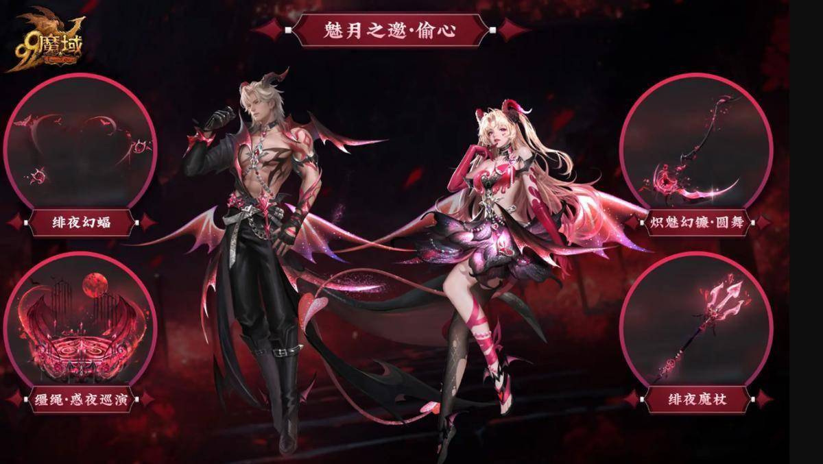 “魅月偷心”外套采用修身古堡礼裙/劲装版型,暗系主色调点缀月光银与魅夜红,慵懒中透着魅惑;“甜幻之魅”外套则走甜系暗黑路线,女装粉色露腰长衣配渐变黑红百褶裙,男装酒红色丝绒衬衫外搭黑色西装,宛如古堡里的优雅恶魔执事。配套的缰绳“惑夜巡演”与玩具“炽魅幻镰·圆舞”同样设计精良,让整套装扮氛围感拉满。值得关注的是,宝库还将同步推出7级珍兽/超兽灵药,一颗顶三次养成!