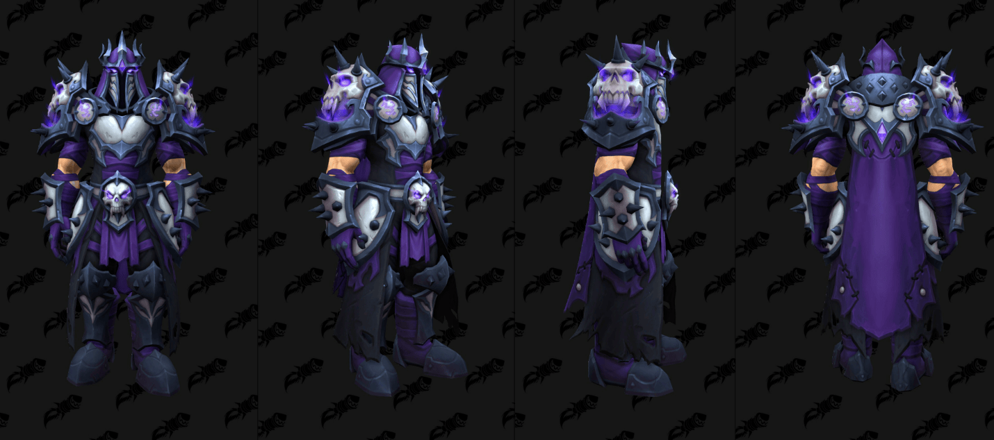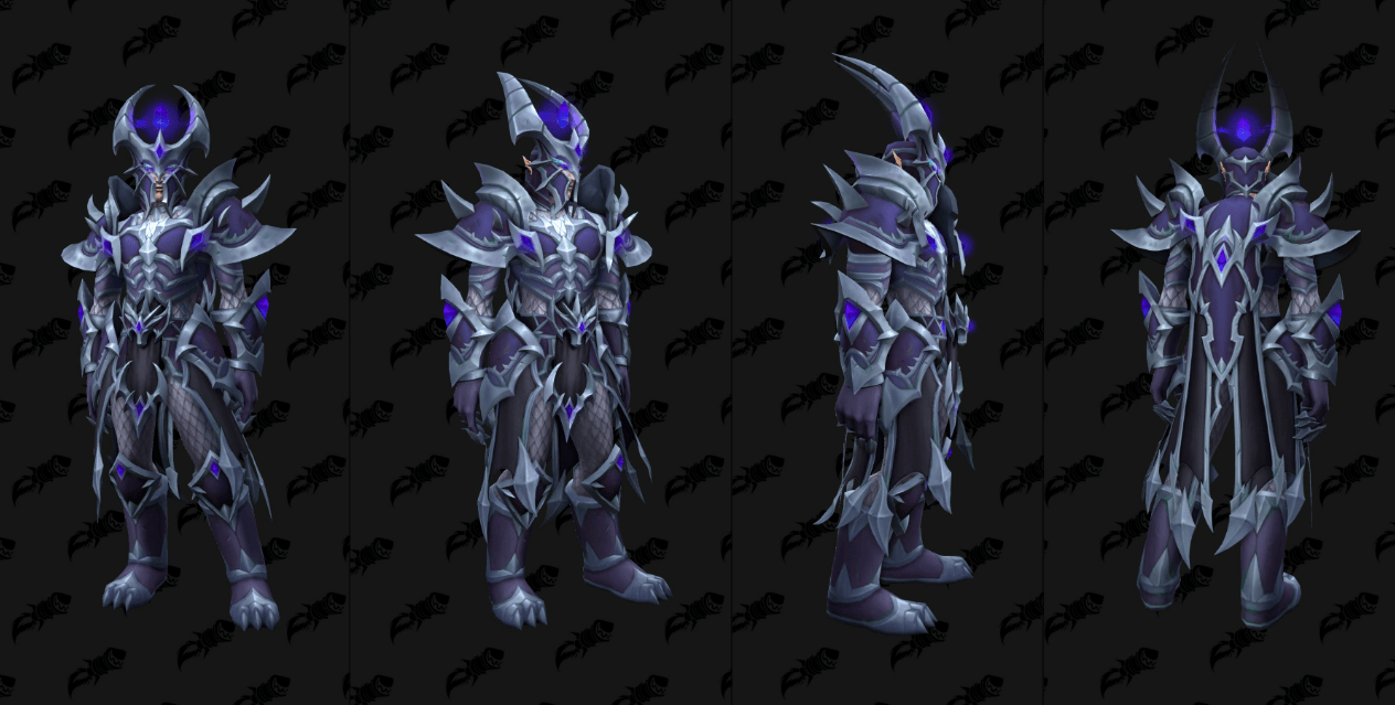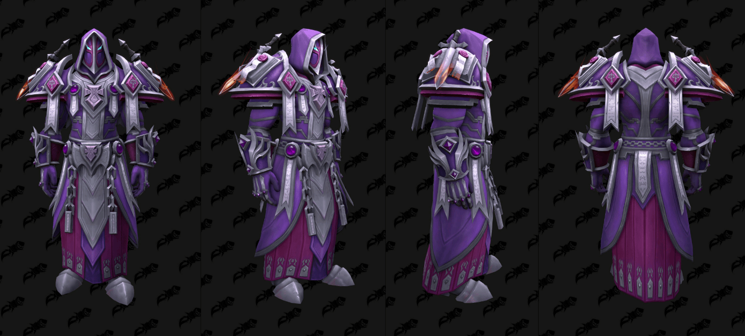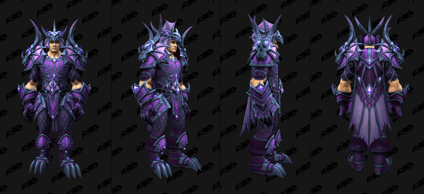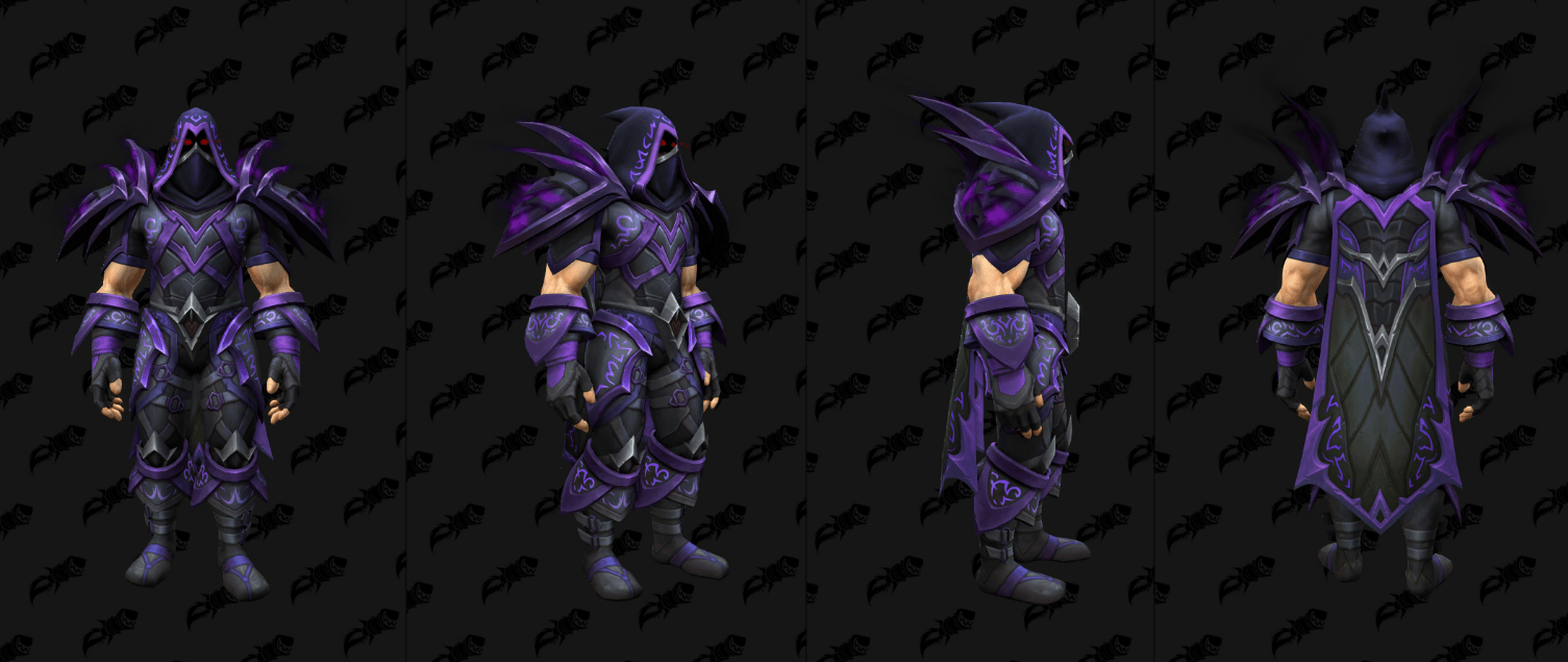 外媒通过数据挖掘,发现了《魔兽世界》全新“虚空”版的T2套模型,这些幻化将作为12.0.5补丁全新“虚空突袭”(the new Void Assaults)活动的奖励登场,其中包括了备受瞩目的骑士经典紫色审判套。