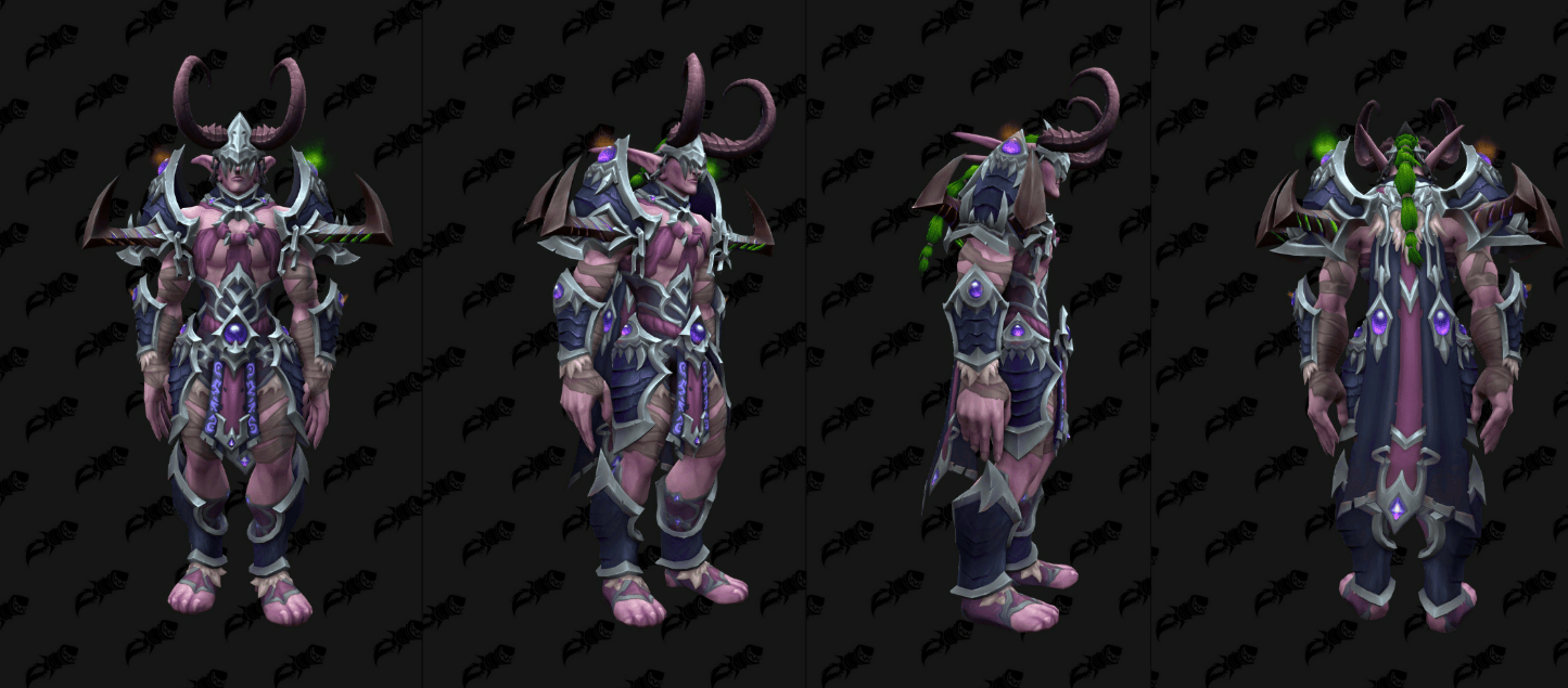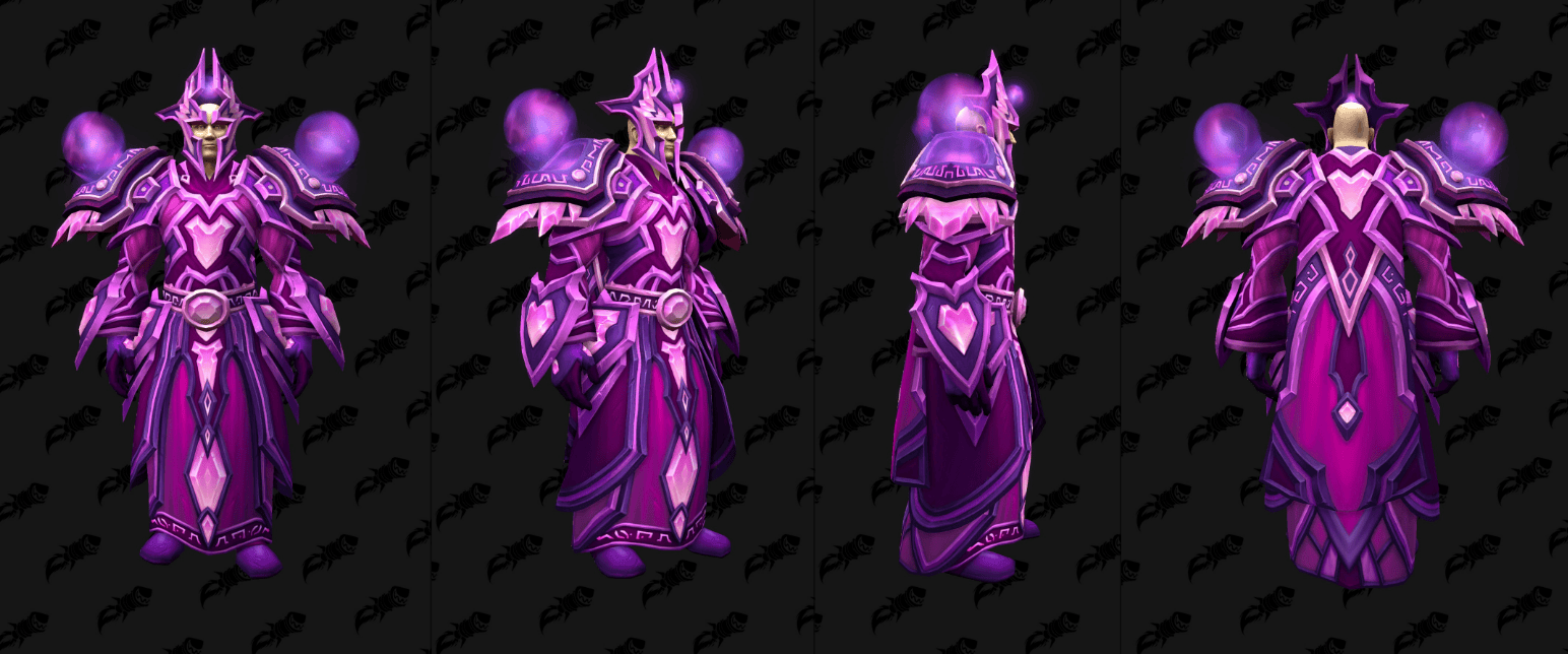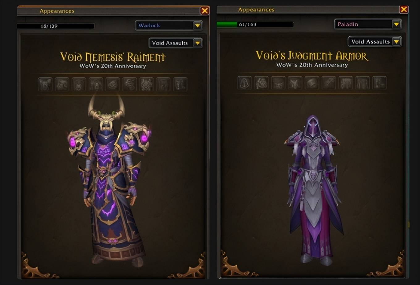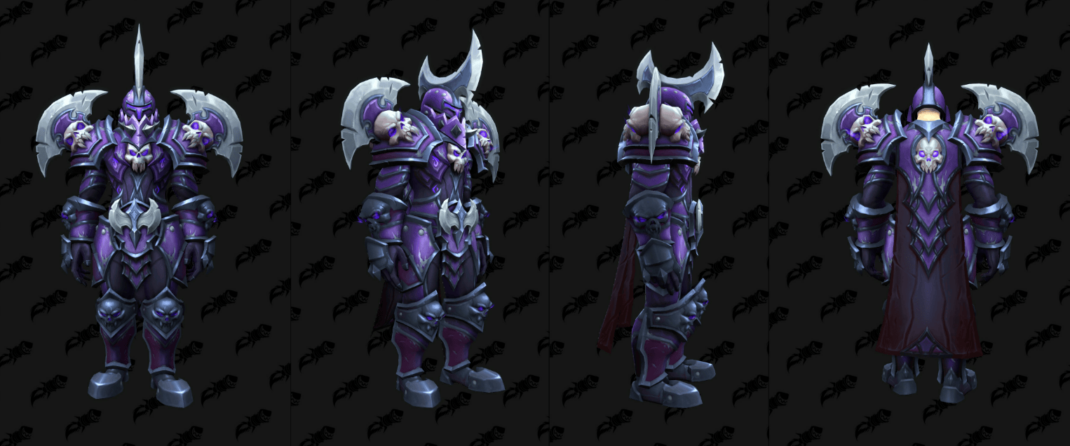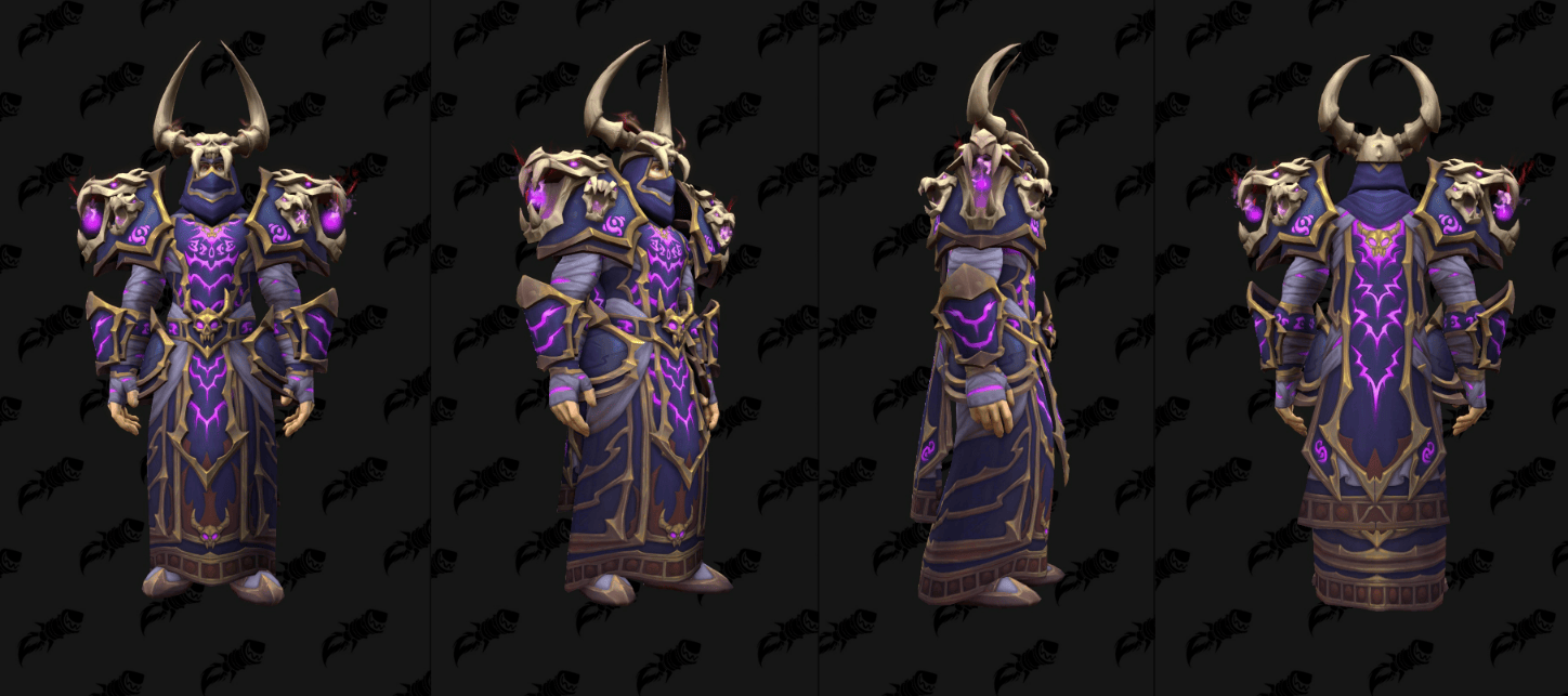 外媒通过数据挖掘,发现了《魔兽世界》全新“虚空”版的T2套模型,这些幻化将作为12.0.5补丁全新“虚空突袭”(the new Void Assaults)活动的奖励登场,其中包括了备受瞩目的骑士经典紫色审判套。