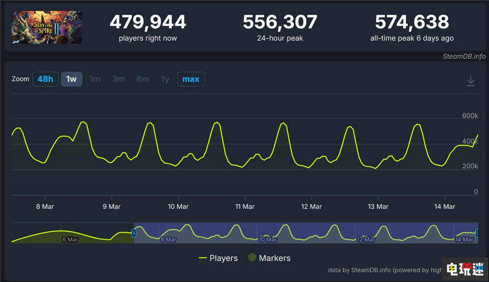 《杀戮尖塔2》的首发表现已经超越《艾尔登法环:黑夜君临》成为Steam首发最成功的Rogue游戏。目前游戏的Steam玩家峰值已经达到57.4万,目前也维持着47万的玩家在线。