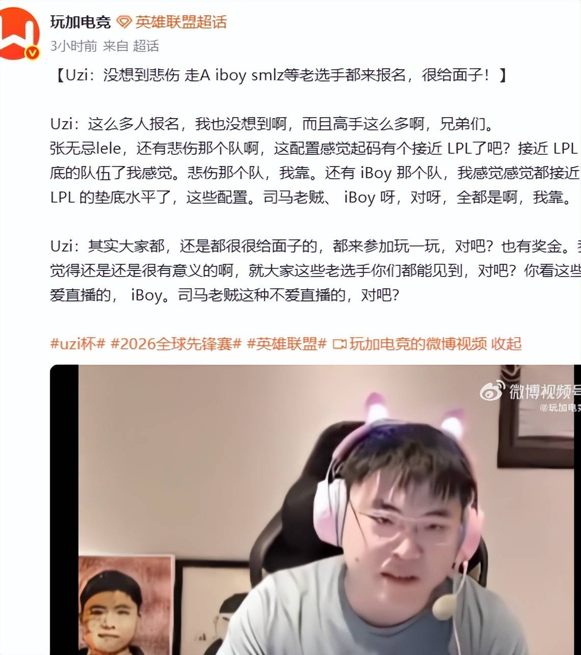 这不,目前UZI杯报名太火爆了,参赛战队数量也是超出了预期,UZI都直呼没有想到,而且还有不少之前有名的退役职业选手,Iboy、Smlz等,这都是知名的退役职业AD啊,实力太强了,越来越期待了,毕竟后半段赛程的时候,UZI都会带队出征的,这个阵容强度,不输LPL了,有点意思。