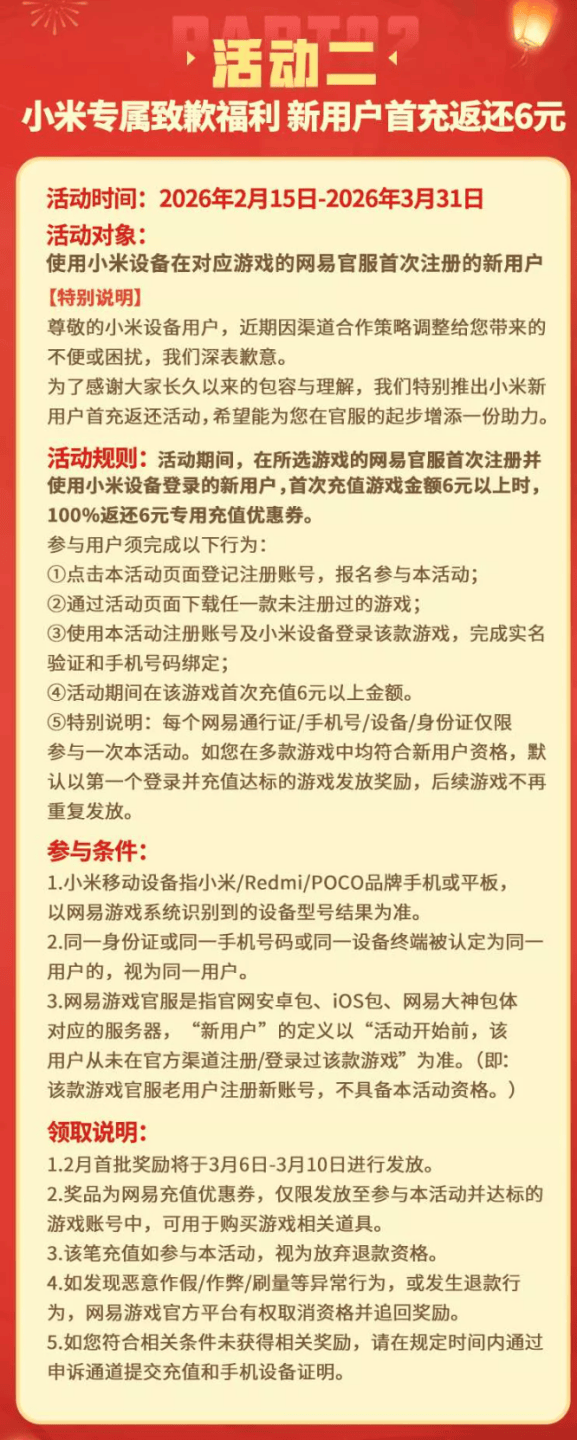 所以这下大家也明白为何官服对渠道服玩家会有这么大吸引力了吧!如果你是小米渠道服玩家,那么现在就是你入驻官服的最好机会!因为网易游戏针对小米渠道服用户,专门打造了官服入驻专属福利活动,别的不说,只要你首次注册登录并充个首充6米,就能直接 100%返还6米充值优惠券,福利爽度直接翻番!