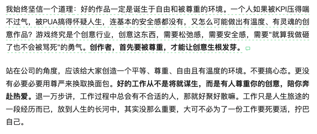 易修钦还在招聘文章中提及了公司理念,他表示,“好的作品一定是诞生于自由和被尊重的环境。一个人如果被KPI压得喘不过气,被PUA搞得怀疑人生,连基本的安全感都没有,又怎么可能做出有温度、有灵魂的创意作品?游戏终究是个创意行业,创意这东西,需要松弛感,需要安全感,需要‘就算我做砸了也不会被骂死’的勇气。创作者,首先要被尊重,才能让创意生根发芽。”