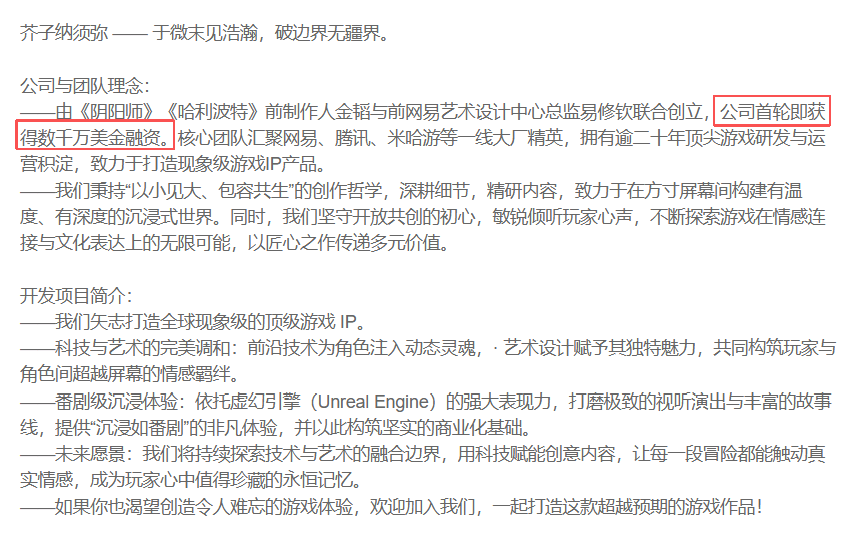 文章透露,公司从去年10月开始筹备,已获数千万美元融资。目前他们未做公开宣传,无官方官网,仅靠行业内 “人传人” 的方式完成人才招募,至今团队规模已超60人,核心团队来自网易、腾讯、米哈游等一线大厂。