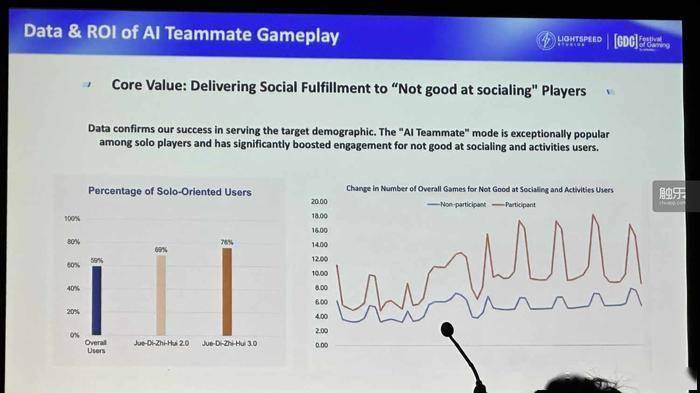 而在腾讯游戏众多演讲中,光子工作室群的《和平精英》的AI队友是一个已经大规模落地、并且实打实带来了游戏玩法改变和用户增长的成果,这在现场所有的AI相关分享中都独树一帜。团队从2025年4月就开始对与AI伙伴共同作战的“绝地指挥”玩法进行灰度测试,在当年7月正式上线,至今已经迭代了3个版本。就在3月13日,游戏还上线了新的AI队友“龙虾”。