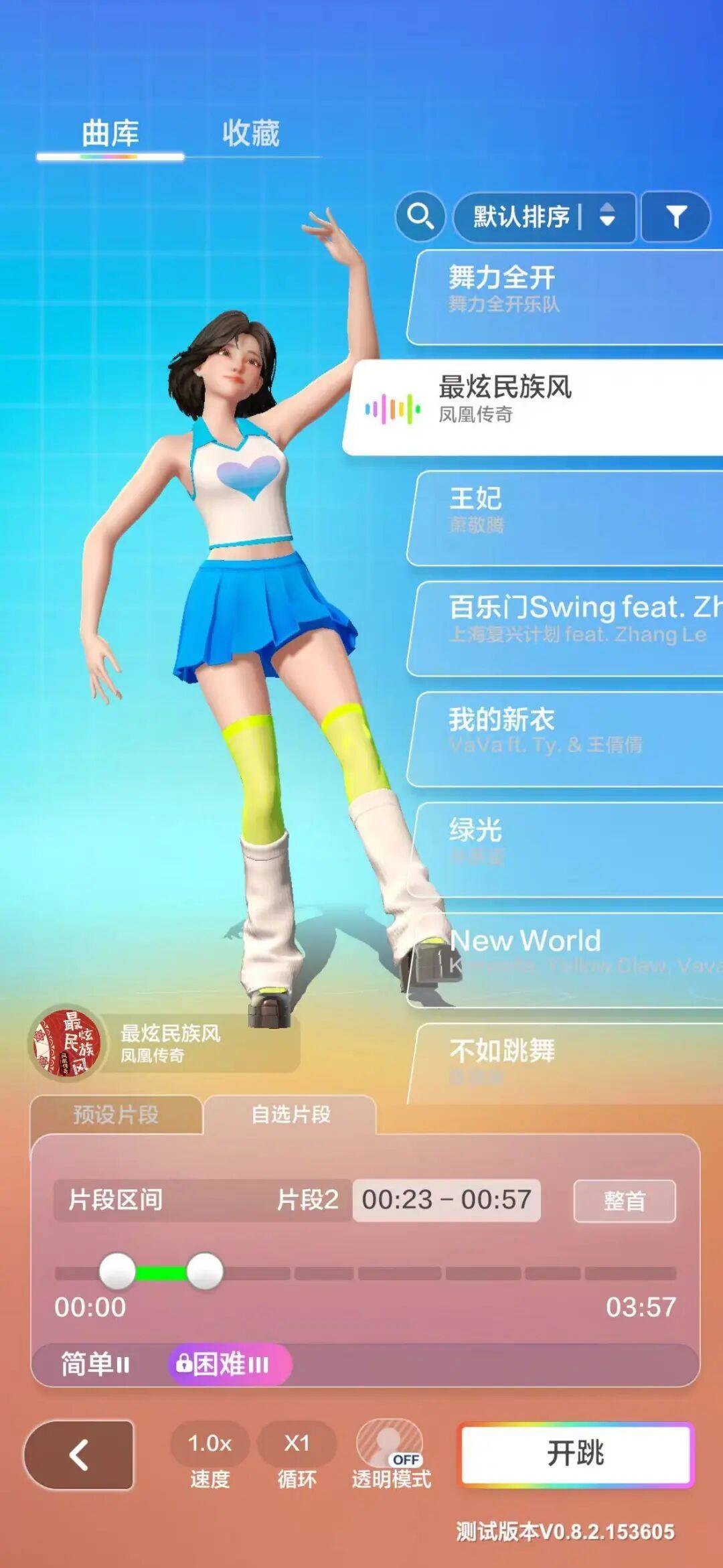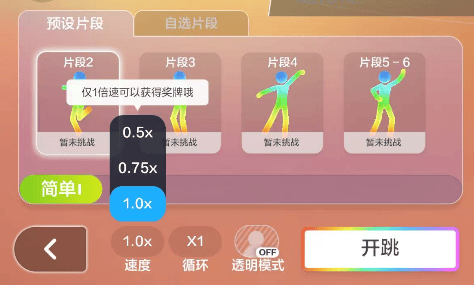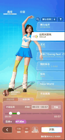 该模式四个核心功能,完美适配零基础玩家和进阶玩家的不同需求:片段练习功能支持自由选择歌曲的任意段落,不用反复跳完整首歌,专攻动作难点、精准攻克短板;慢速播放功能可自主调低动作播放速度,从0.5倍速,到0.75倍速再到1倍速,把每一个舞蹈细节、肢体走位清晰拆解,新手玩家可以慢慢观察模仿,彻底告别“跟不上、看不清”的尴尬;重复练习功能支持单个动作或片段循环播放,帮玩家反复打磨动作熟练度,快速形成肌肉记忆,真正把动作刻进骨子里;镜子模式则提供反向镜面视角,和玩家面对面练舞的视角完全一致,不用再纠结动作反向,模仿起来更顺畅、更直观。