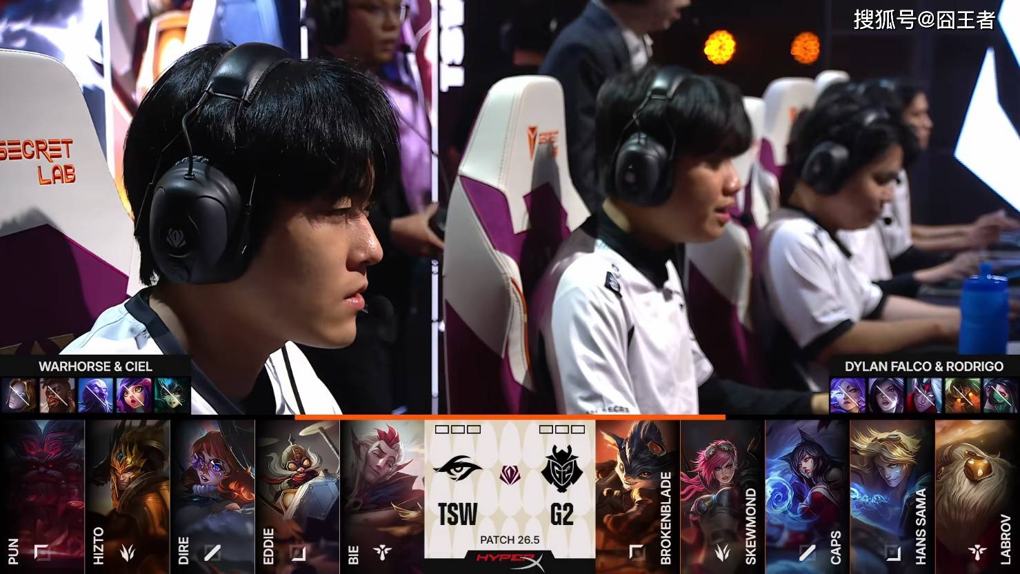 第一局比赛,T SW蓝色方,禁用:发条、奎桑提、瑞兹、妮蔻、娜美,选用:Pun奥恩、Hizto皇子、Dire阿萝拉、Eddie飞机、Bie洛;G 2红色方,禁用:阿卡丽、泰坦、韦鲁斯、卡莎、芸阿娜,选用:BrokenBlade兰博、SkewMond蔚、Caps阿狸、Hans Sama伊泽瑞尔、Labrov巴德