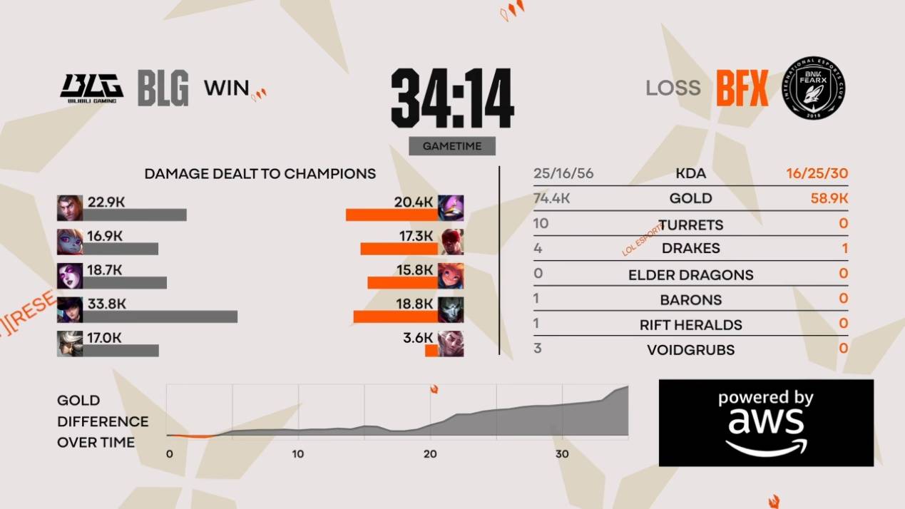 韩国队BFX根本没想到BLG第一局上来就这么猛,被打得节奏全无,即使缓过神来强行稳住局面,也因为劣势过大被BLG带走。