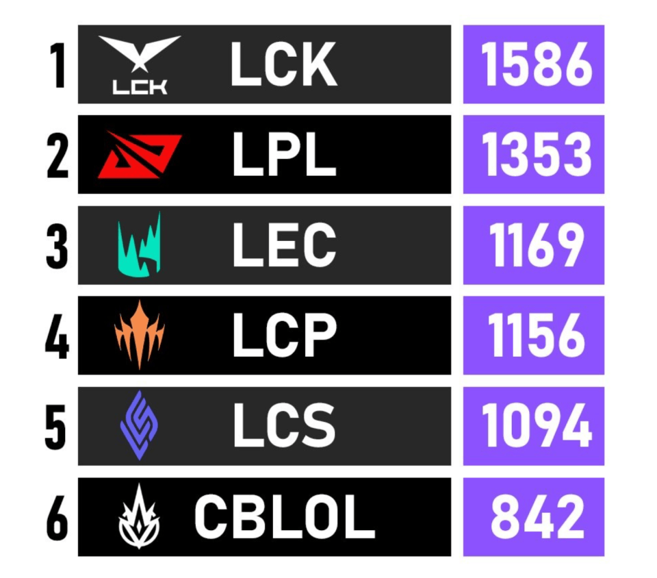 在近年来的LOL战队战力榜,全球排名始终都是LCK占据一片天,在先锋赛开打之前,LCK赛区就是以1586的战力排在首位,LPL赛区则是1353的战力排在第二。战力榜是根据赛区里战队的成绩和赛区整体实力排出来的,就算HLE今年在LCK10进9率先被淘汰,但他们靠着以前的积分,依旧还能排在前三的原因!回忆起昔日LPL和LCK在BO5里的交手,我们忘不了先锋赛陀螺的故事,更忘不了T1数次带来的统治和压制,从当年RNG数次的陨落,再到LNG忠诚的故事,再到滔搏数次的跌倒,这一段BO5失败的故事我们已经看够了!如今再回过头看看Bin那一句外战看BLG,似乎确实有所含义!
