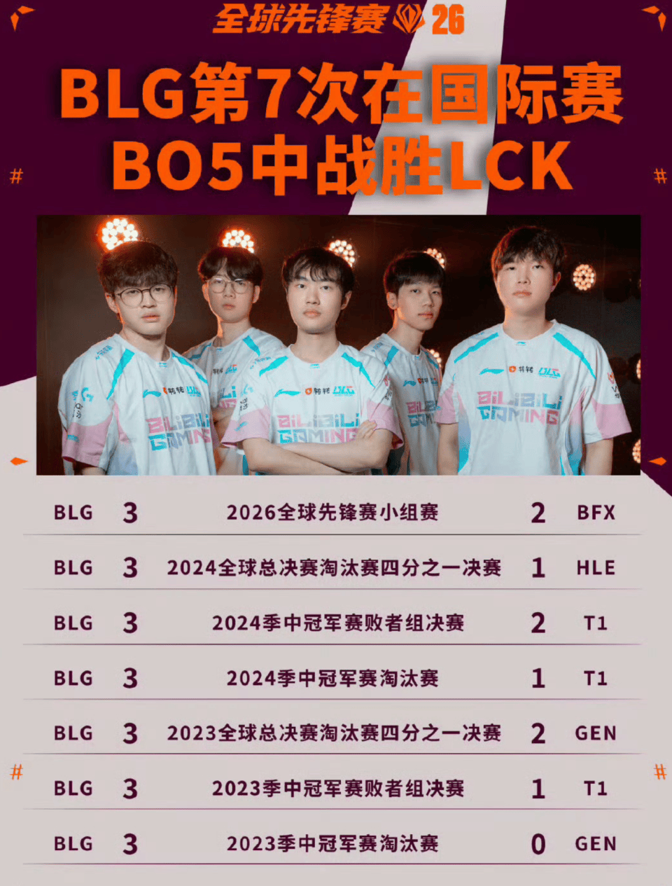 这是BLG第七次在国际赛的BO5中战胜LCK,我们不可否认BLG也确实输过,在S14决赛惜败过T1,在MSI惜败过GEN,但他们确实是目前BO5赢得最多的战队!从23年季中赛对T1和GEN的双杀,再到S13对GEN的淘汰,也曾在24年MSI两度淘汰过T1!从数据层面,BLG确实就是外战最强的,也希望他们能够保持这股韧劲,重铸LPL的荣光,还需要从战胜BFX的这一点点火苗来开始!加油吧BLG,同时也希望JDG能够面对GEN打出超绝表现!
