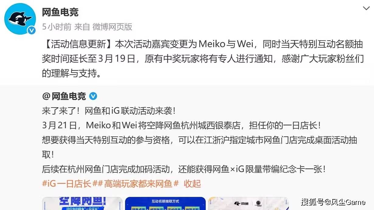 IG联动网咖近日发布公告:活动嘉宾更换为Meiko和Wei(原本是肉鸡和Wei),取消中单的线下活动,把妹控拉出来救场,看来IG和网咖,也是害怕Rookie去现场,观众会线下真实引发骚乱,第二赛段开赛之前,肉鸡应该不会参加任何活动了,他得等舆论彻底消散,才能出现在大众视野。