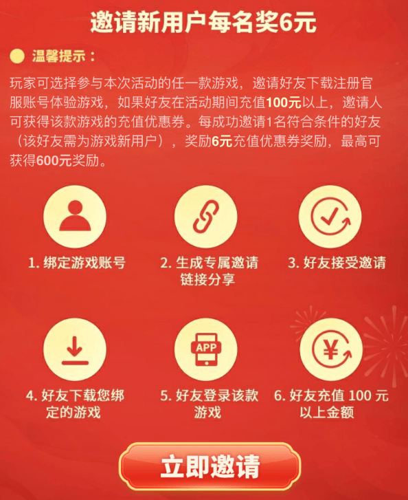 老玩家也别急,拉新用户入坑就能拿奖励!每成功邀请1人充值100R以上,你就得6R券,最高能薅600米!