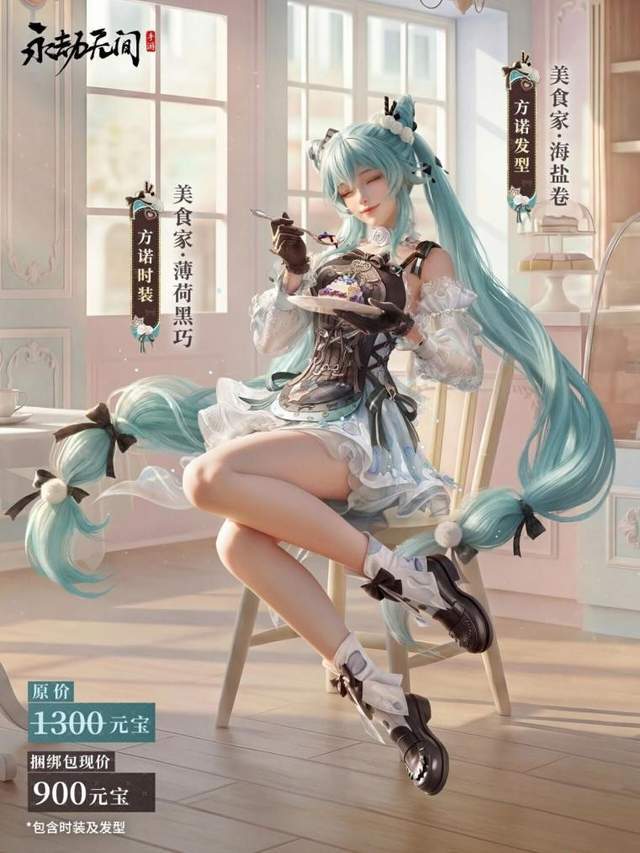 淡蓝色纱裙层层叠叠,蝴蝶结白袜配小皮鞋,薄荷蓝长发盘成甜品造型,双马尾上还挂着黑巧和绒球,这哪是时装啊?这是把整个甜品店穿在了身上!打起架来怕不是要掉出马卡龙和曲奇饼干(战术后仰)。