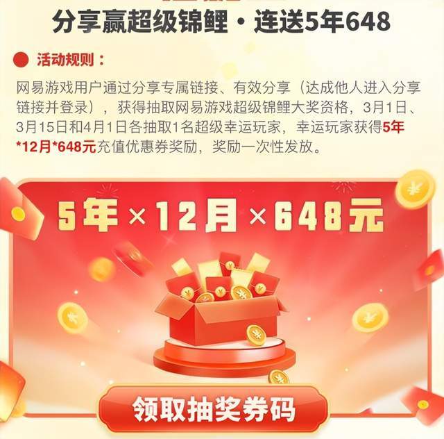最豪横的是这个“超级锦鲤”活动!3月31日会抽1个天选之子,直接送5年×12个月×648R的充值券,算下来就是38880R!中奖者怕是要被全服玩家追杀抢账号(开玩笑的)。不过话说回来,这奖励力度,网易今年KPI是打算靠抽奖完成吗?
