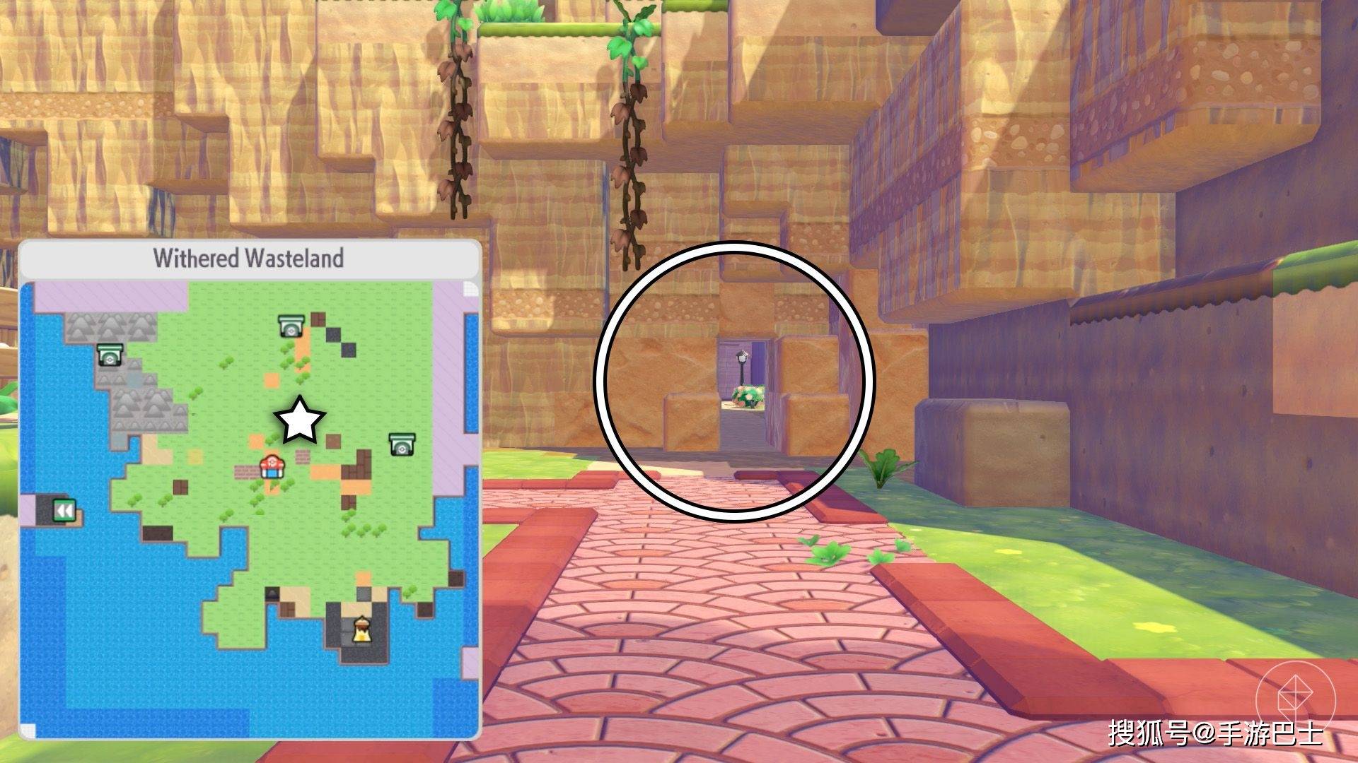 你可以通过打破枯萎荒原宝可梦中心东北方向的这面砂岩墙找到神殿: