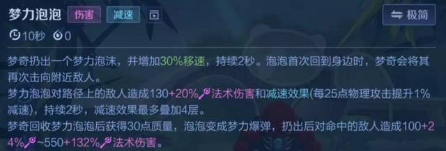 更别提二技能的减速成本也相当低了,扔过去没中还有第二段拉回来,也没中就等第三段弹过去,只要不是突然460,梦奇就能100%触发减速。