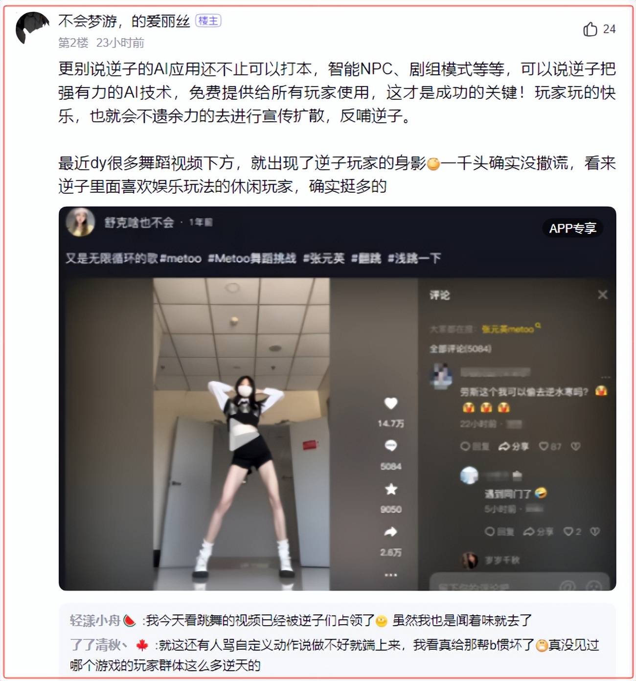 该功能上线后,受到了玩家们强烈的追捧,因为其方便的特性,能够最大化的释放玩家的创作欲望,让玩家们从单纯的使用者变成创作者,当自己的导演。在极短的时间内,就吸引了数以百万计的玩家,产出了海量的原创内容。更有很多人涌入抖音、B站等视频网站的舞蹈专区下面,向内容创作者申请动作搬运和二创,带起一次又一次的风潮。