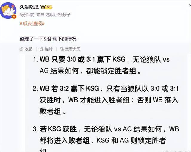 WB首胜之后,接下来WB和KSG,还有AG和狼队的比赛,就是绝对焦点了,胜者组大结局的对决,很期待啊。但是这个算分,真的太复杂了,胜者组的算分,看晕了,还好有大佬完美总结了一波,看的很清楚,各位仔细分析下。