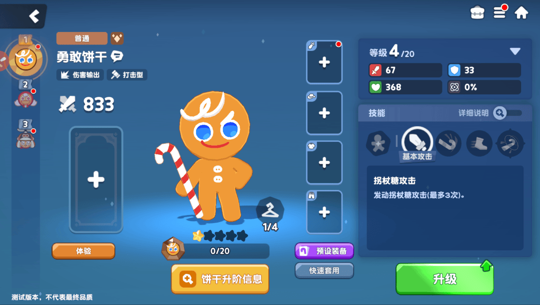 以初始角色勇敢饼干为例,它的「拐杖糖攻击」就是平A,而特殊技能「勇敢出击」会让拐杖重劈地面,造成范围伤害,大招「永不退缩」则在此基础上增加了冲刺和额外范围伤害。