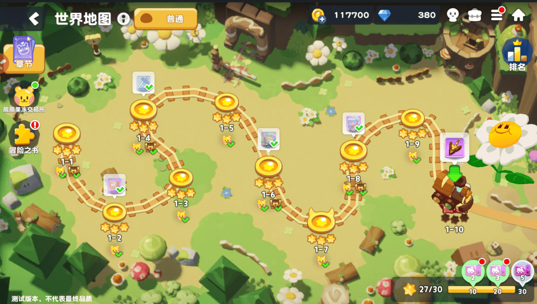 而在探索方面,熊软糖藏在地图的角落或者敌人身上,收集够了可以在熊软糖商店兑换游戏资源;蓝莓鸟出现在附近就意味着周围有隐藏宝箱;每个关卡还有三个星级任务,比如限时通关、全收集、零阵亡等要求,完成后可以获得星星煤炭来驱动火车升级。