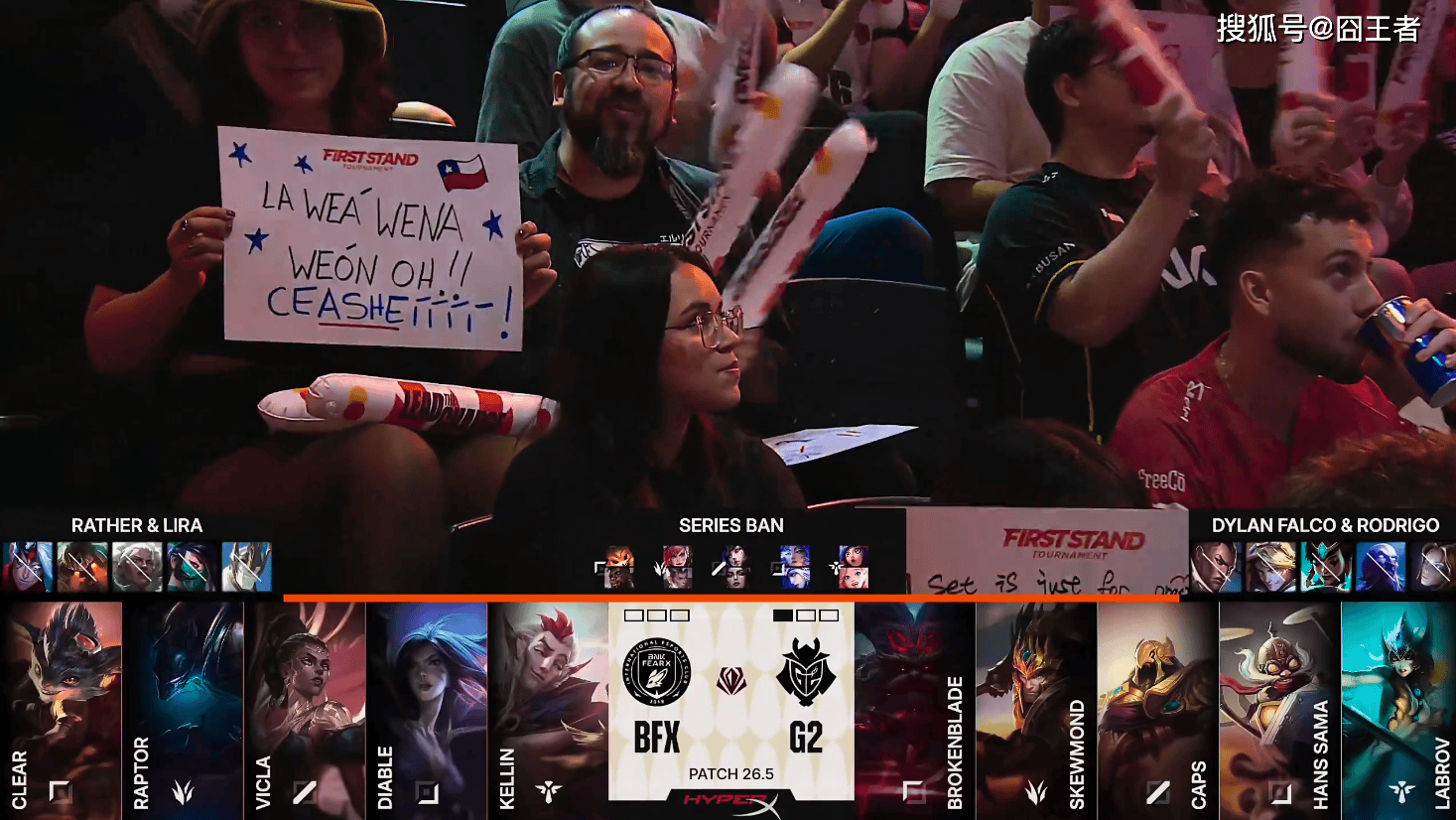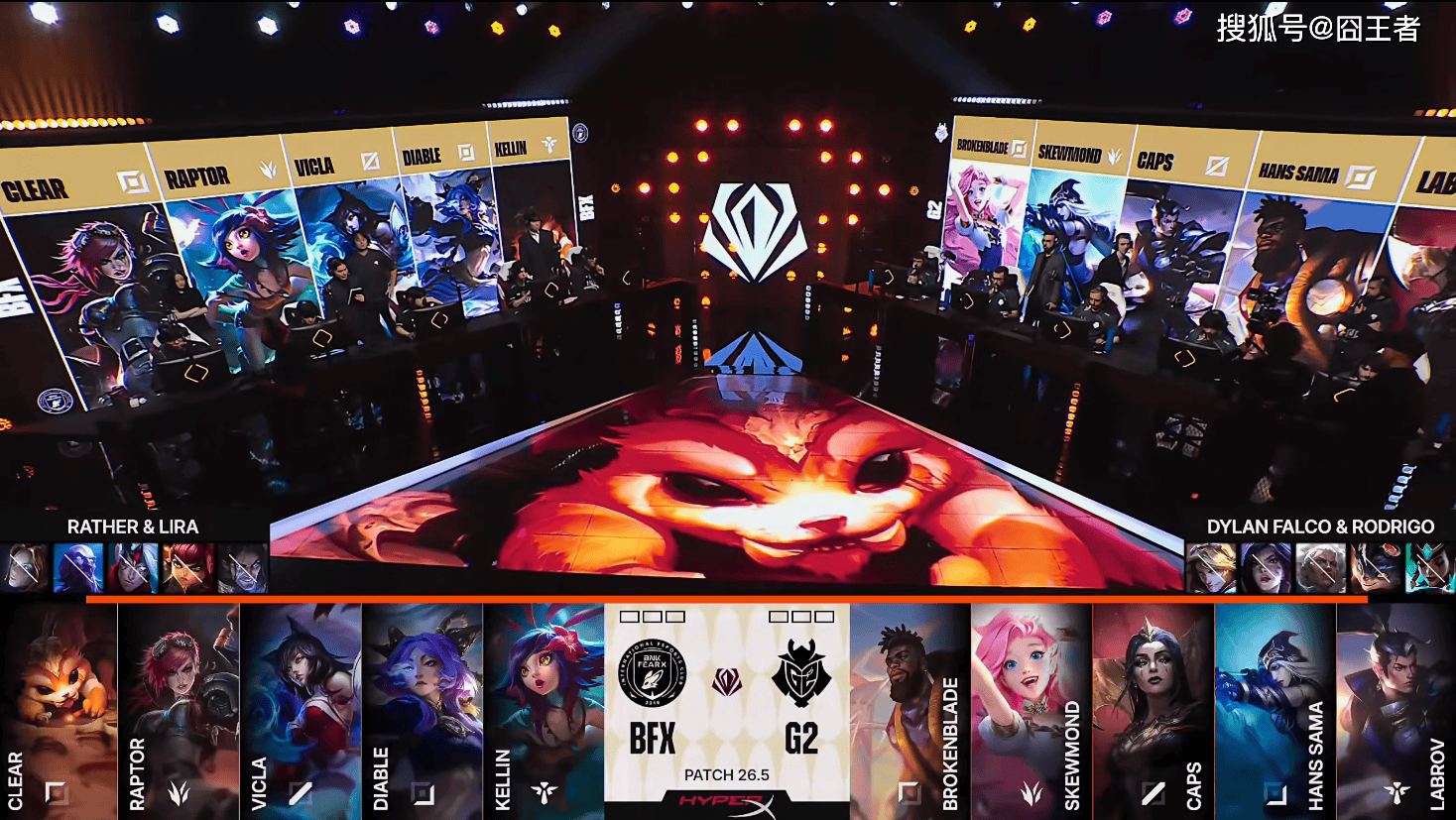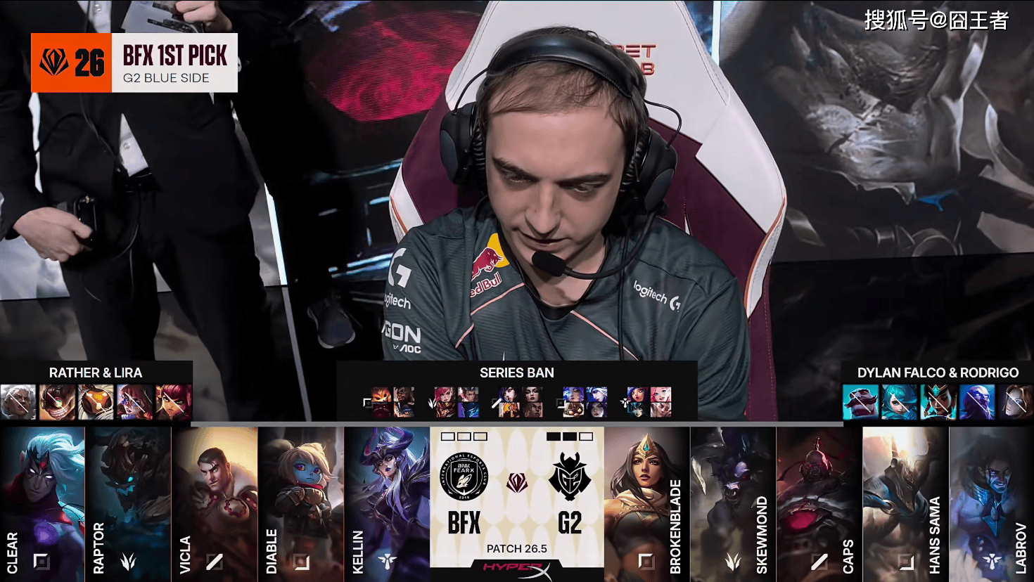 第一局比赛,BFX蓝色方,禁用:发条;瑞兹;韦鲁斯;安妮;塞拉斯,选用:Clear纳尔;Raptor蔚;VicLa阿狸;Diable芸阿娜;Kellin妮蔻;G2红色方,禁用:卡尔玛;兰博;狼母;卡莎;伊泽瑞尔,选用:BrokenBlade奎桑提;SkewMond赵信;Caps妖姬;Hans Sama寒冰;Labrov萨勒芬妮