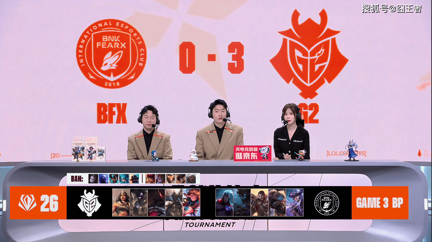 第三局比赛,G2蓝色方,禁用:发条;瑞兹;卡尔玛;格温;布隆,选用:BrokenBlade塞恩;SkewMond潘森;Caps佐伊;Hans Sama希维尔;Labrov牛头;BFX红色方,禁用:狼母;炸弹人;巴德;阿萝拉;安妮,选用:clear杰斯;Raptor大树;VicLa辛德拉;Diable韦鲁斯;kellin波比