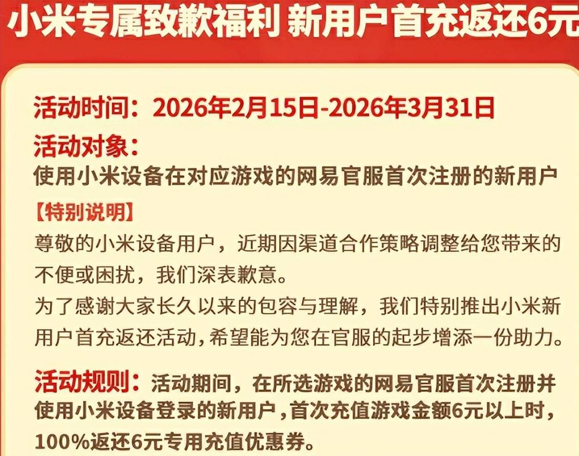 先说说我俩的“第五专属薅法”,作为小米设备用户,在活动期间首次注册网易官服游戏,首充6r直接能返6r专属优惠券券,相当于白嫖了个首充奖励。小编表示,这次网易专属致歉福利,是真的诚意十足,白嫖福利拿到手后我和闺蜜直接在被窝笑出声!