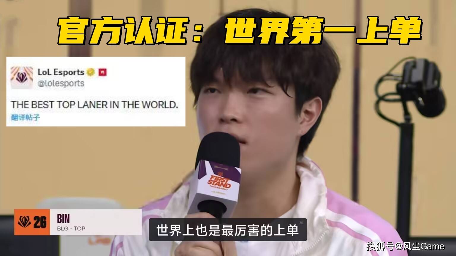 BLG拿下冠军之后,英雄联盟官方分享Bin哥捧杯照,并且配文:世界第一上单,连官方都认可了,Bin哥世一上真实至名归了,Bin哥的牌面还不止于此,湖北电子竞技运动协会,在Bin拿下FMVP之后,直接发文祝贺Bin哥和俱乐部,能够说到做到的Bin,俨然是电竞圈青年代表人物了。