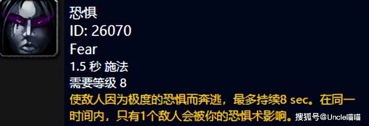 对于术士的恐惧,喵叔表示我是最反感与害怕的技能之一了,特别是TBC时期打竞技场,遇见对面有术士,心理层面已经输了一半!该技能真的是完美演绎了术士的职业特性,不知道各位大兄弟是否认同?