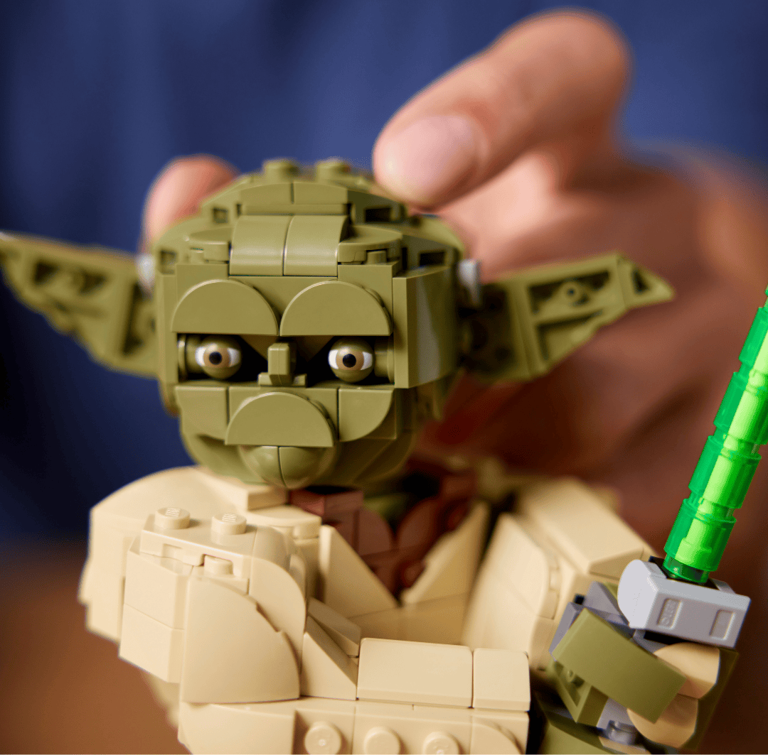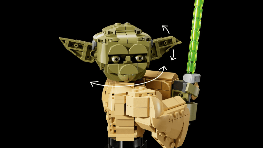 乐高集团在还原有机角色方面本就具有挑战,小比例设计使得面部细节更难处理。尤达半身像使用了印刷眼睛和巧妙的零件堆叠来增加层次感,但整体造型过于夸张,与人们印象中那位沉稳、睿智的绝地大师形象存在较大差距。