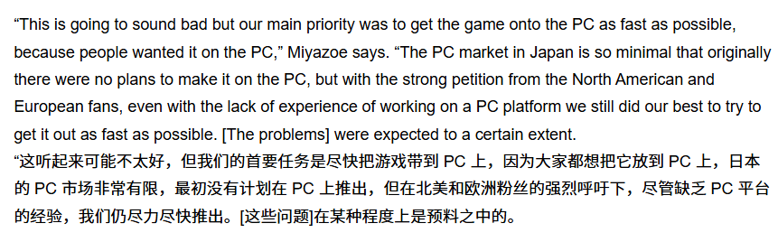 在日本,PC市场本就不大,他们之前也没有真正考虑过这部分用户。直到后来《黑暗之魂2》上市前夕,开发团队仍透露:公司内部本来没有登录PC的计划,奈何欧美粉丝过于热情,才促成了《受死版》的诞生。