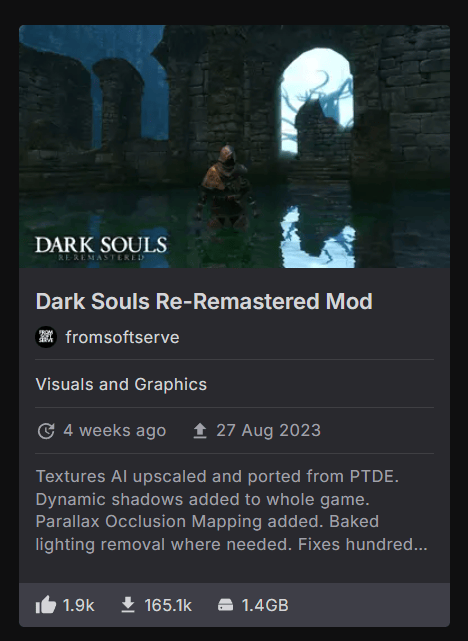 在全球最大的MOD网站Nexus里,《黑暗之魂:重制版》下载量第五多的MOD,是把《受死版》的纹理,全面移植到《重制版》里,并且尽可能地还原《受死版》光影效果的画面“反向增强”MOD。