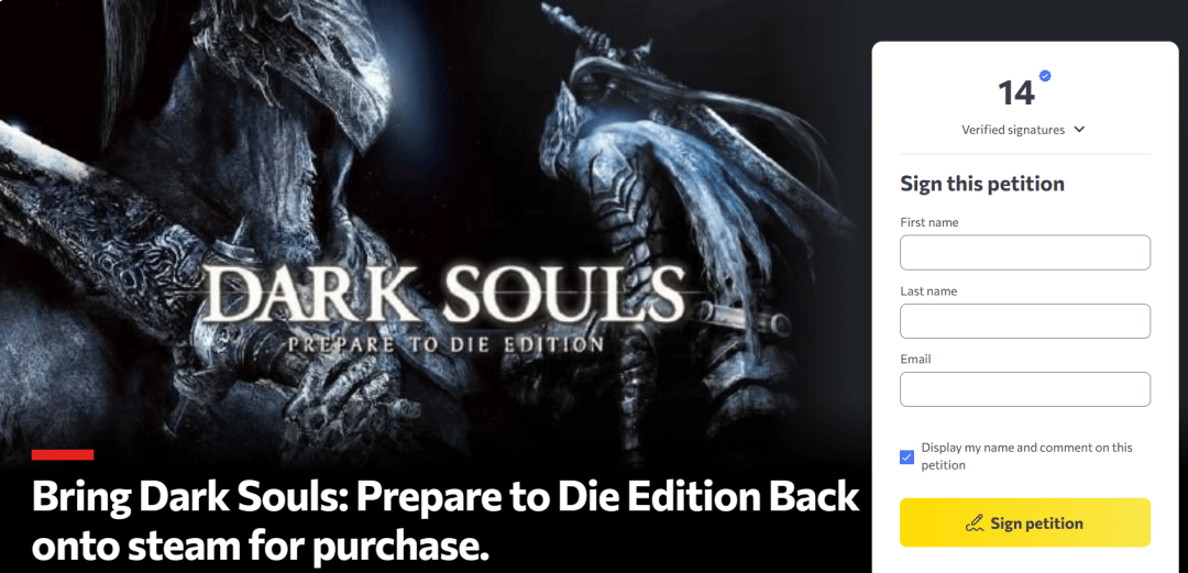 在2018年,《黑暗之魂:重制版》发售后,有玩家发起过请愿活动,希望FS社重新上架《受死版》。最终只有14名玩家参与了这项请愿的。足以见得《受死版》在当时是真的不受待见。