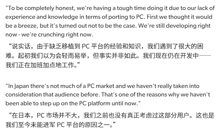 2012年,在接受外媒采访时,制作人内山大辅表示,由于缺乏PC移植的经验和知识,FS社在移植过程中遇到了很多的困难。起初他们以为会轻而易举,但事实并非如此。