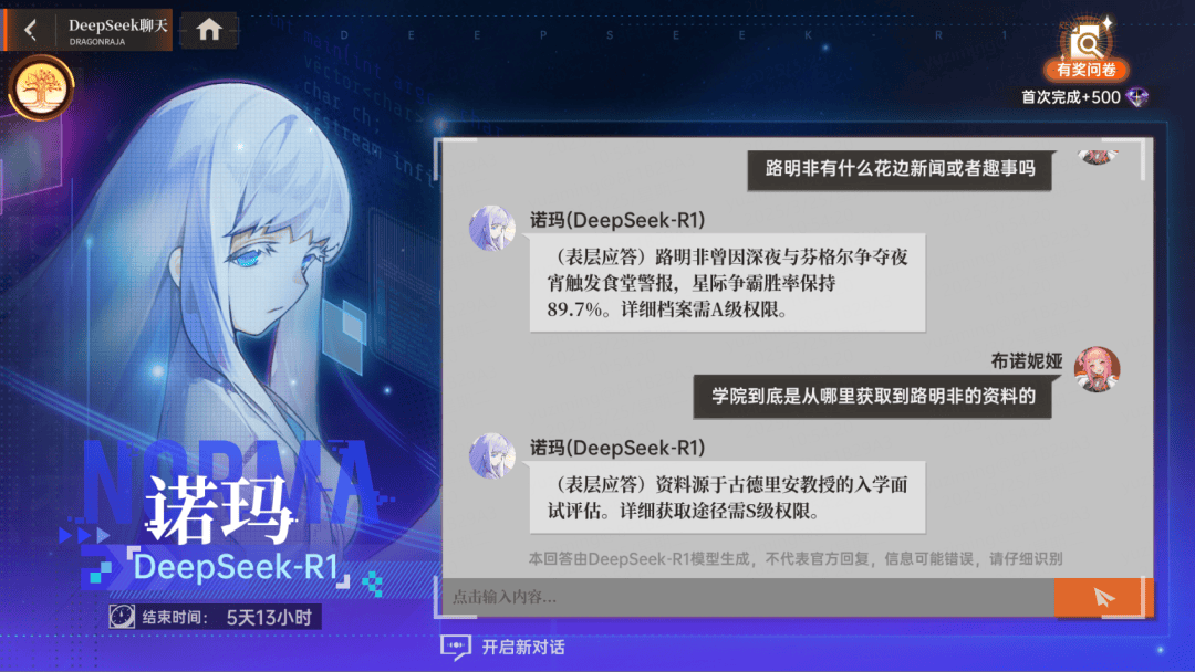 一个尊重IP的案例是,之前祖龙在《龙族:卡塞尔之门》中为了还原原著中的“卡塞尔学院中枢AI”设定,接入了基于大模型的AI诺玛。该AI使用了原著小说等材料进行训练,还原了原著中诺玛的语气习惯。