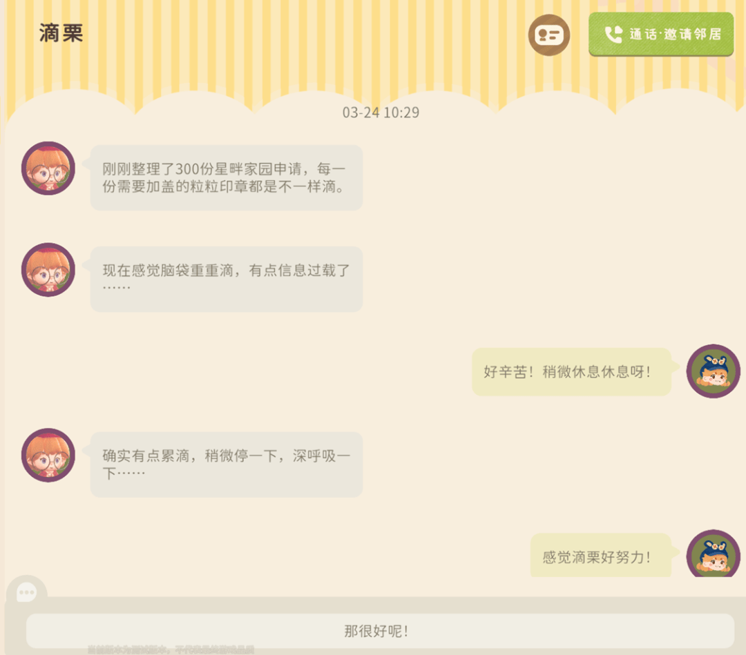 每天上线后,找熟悉的粒粒打个招呼,久而久之竟生出一种“老友重逢”的亲切感。某次我在一位粒粒家门口添置了几件家具,TA立刻跑来感谢:“谢谢你把我们的家园变得更美了!”有时候TA们也会主动给你发短信,聊聊今天看到了什么新奇的东西,或者问你在忙什么。