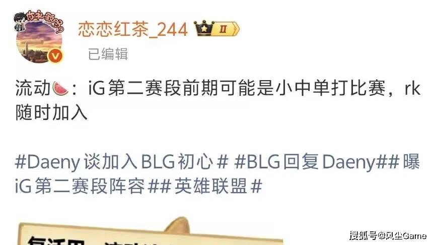 爆料博主红茶透露:IG第二赛段前期,可能是小中单Renard首发,Rookie打替补,随时都可以上场,这都已经回来了,不上去打比赛啥意思?Rookie是担心,自己被观众骂?还是说,新女友甜蜜期没过,打算再享受享受,不过话又说回来,Renard打完德杯一次没上过场,真得让他试试。