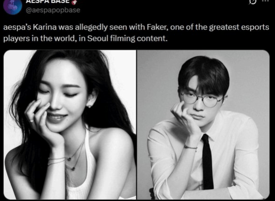 据悉,该传闻由外网一个不知名账号发起。该账号声称拍到了两人在首尔某地同行的照片,并暗示双方正处于恋爱关系中。随文配发的图片中,Faker和Karina分别以相似的构图出镜,乍一看颇具“情侣画报”的既视感。爆料迅速在海外社区发酵,随后被搬运至国内,引发电竞圈和韩娱粉丝的双重震动。