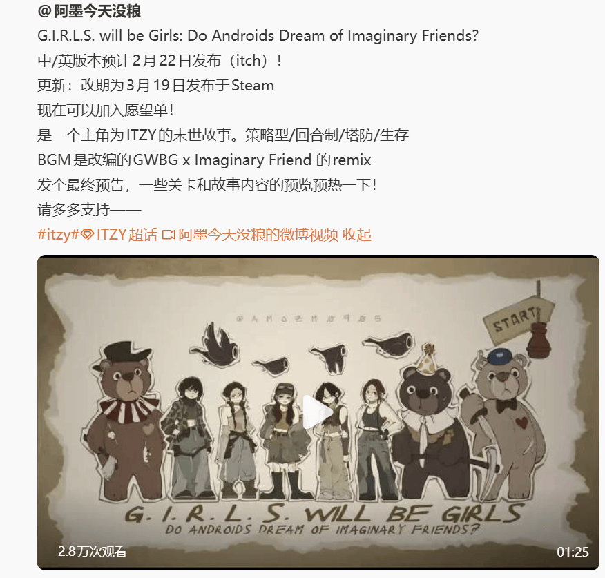 这款游戏由ITZY的中国粉丝阿墨制作,除了游戏开发,阿墨也经常在微博上更新一些高质量的同人图。从去年7月开始,阿墨着手制作《G.I.R.L.S. will be Girls》,历经大半年时间,才将作品逐步完善并最终上线。