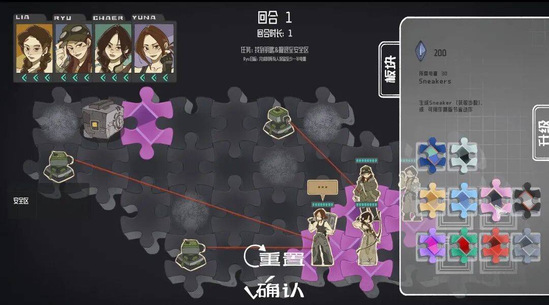 玩家需要在有限回合内指挥这支少女小队,通过铺设不同属性的板块,并安排五位角色的站位与移动,最终完成不同类型的任务。
